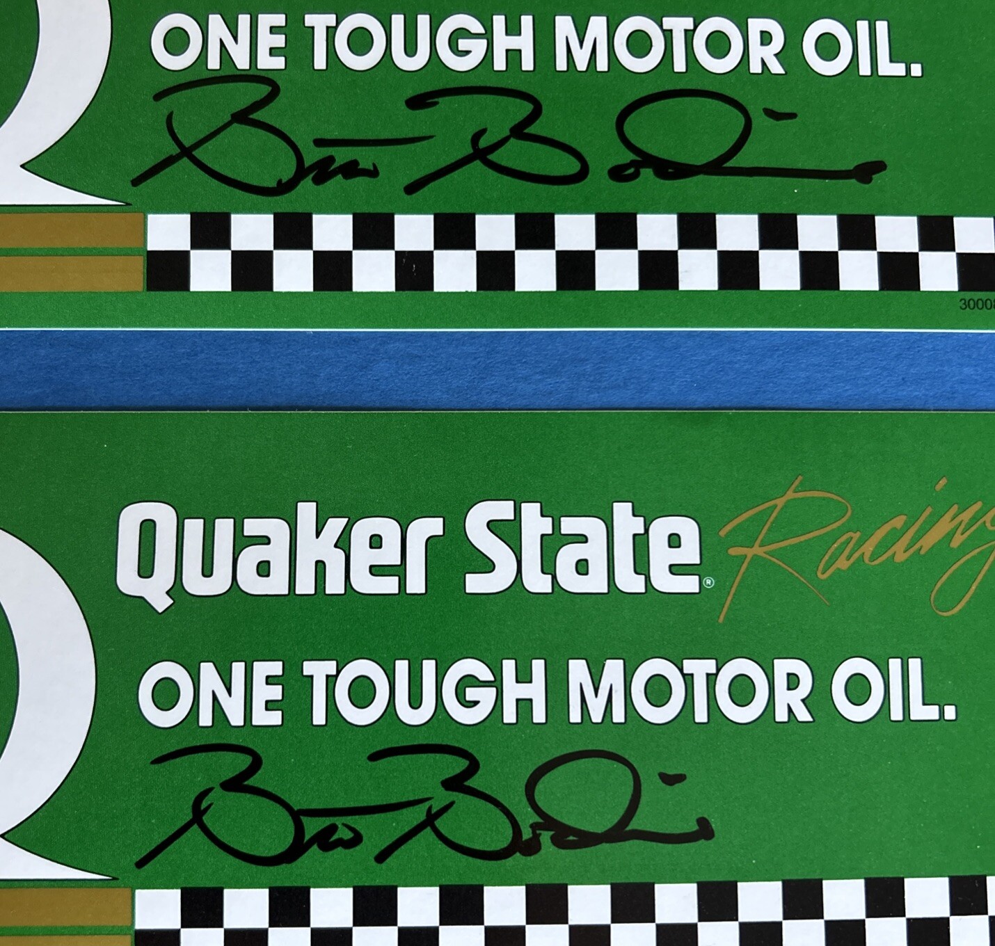 A pair of BRETT BODINE Signed Autographed Quaker State Racing Bumper Stickers. New Old StockEach one is 3 1/2"x9"These will be sent to your confirmed paypal address. I always ship same or next business day.Shipping is to the lower 48 United States.Thanks for looking and check on my other items for sale!