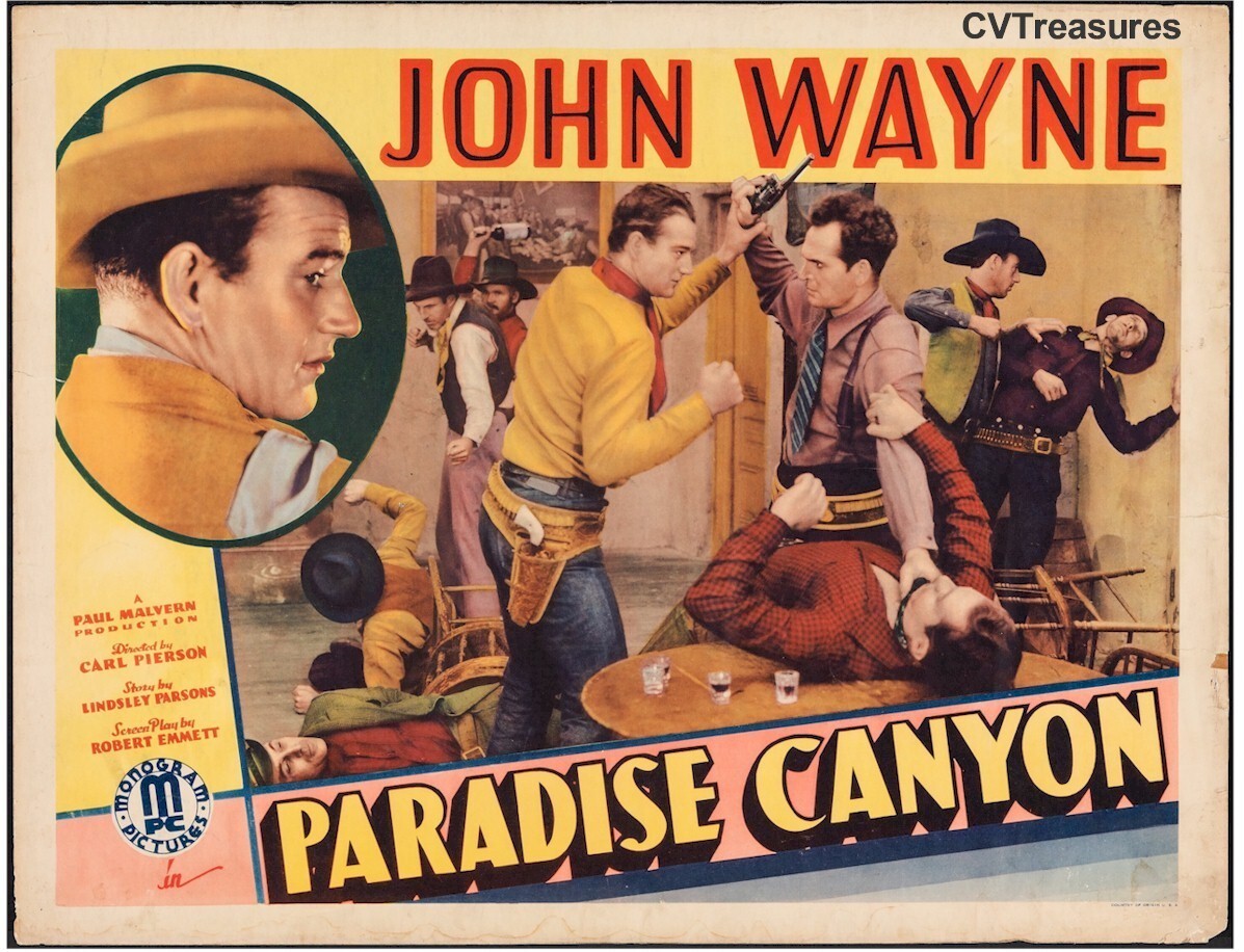 Original vintage classic old Western Movie Theater Film Posters John Wayne Memorabilia Collectibles For SaleParadise Canyon, 1935Original Vintage Western Movie Theater Poster Half Sheet (22x28")Starring (28 yr old) John Wayne Paradise Canyon, VERY RARE Early 1935 Vintage Half Sheet with beautiful close up and action scene of young cowboy John Wayne! And note the stunning colors and superior graphics! And the added striking photo inset of Wayne at top left! If you think you have all the John Wayne posters you need...think again!. NOTE: this is one of the earliest John Wayne movie posters we've ever offered! You'll need to make a little room for this highly scarce, breath-taking gem of a find!. Spectacular artwork. In addition to the breath-taking super large action scene close-up, is the terrific inset image of the Duke! * See enlargeable image above Note: This is the first time in our 40 years collecting we have acquired this poster. It is also one of the earliest pieces of John Wayne Original Vintage Movie Paper we've ever offered. A Three Sheet for this film sold in November 2020 for $15,600! Important Added Info: Note that John Wayne had his first chance at stardom in 1930 with "The Big Trail", and when that was not successful, he spent a few years in minor roles, and then became a major B-western star, and stayed that way until 1939, when he made "Stagecoach" and became a major star. At that point, all of his mid 1930s B-westerns were re-released, and no doubt that adds to the rarity of original movie posters from those movies.. Original first release 1934-35 movie paper of any sort from this movie is incredibly scarce! * See enlargeable image above Paradise Canyon (Monogram, 1935). Rolled, Fine. Half Sheet (22" X 28"). Western.The last of the "Lone Star Westerns" John Wayne made for Monogram in the early years of his career, this is probably the most action-packed. As undercover Federal agent John Wyatt, Wayne is on the trail of a counterfeiting ring operating near the Mexico/Arizona border. Legendary stuntman Yakima Canutt supplies much of the action in this picture; Wayne and Canutt soon became good friends and would go on to appear in a number of pictures together.Even if it didn't have his name in bold black and red at the top, there would be no mistaking that this is a John Wayne film. The legend himself is seen in a classic over-the-shoulder pose, and engaging in an intense bar brawl with famed stunt man and preferred Wayne stand-in Yakima Canutt, who is widely known for his amazing stunt work on John Ford's Stagecoach. Starring John Wayne, Marion Burns, Reed Howes, Earle Hodgins, Gino Corrado, Yakima Canutt, Perry Murdock, Gordon Clifford, Henry Hall, and Chuck Baldra. Directed by Carl Pierson. An unrestored poster with good