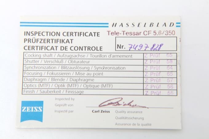 Hasselblad CF Tele-Tessar 350mm F5.6 Lens Used Test Passed with Filter Key FeaturesProduct Description:- Brand: Hasselblad- Model: CF Tele-Tessar 350mm F5.6- Serial Number: 7497828Detailed Features:- Telephoto lens with 350mm focal length and F5.6 aperture- Includes lens filter (quality not guaranteed)- Lens hood and lens cap included- Lens case includedCondition:- Very good used condition with minor surface scratches on the copper mirror- Slight internal dust and minor fungus on the lens filter- Some balsa separation inside the lens- Minor scratches on lens hood and cap- Lens case shows some dirt and wear- Functionality tested and confirmed goodItem Specifics:Brand: Hasselblad Model: CF Tele-Tessar 350mm F5.6 Type: Telephoto Lens Focal Length: 350mm Maximum Aperture: f/5.6 Condition: Used - Very Good Includes: Lens Filter, LensSpecifications